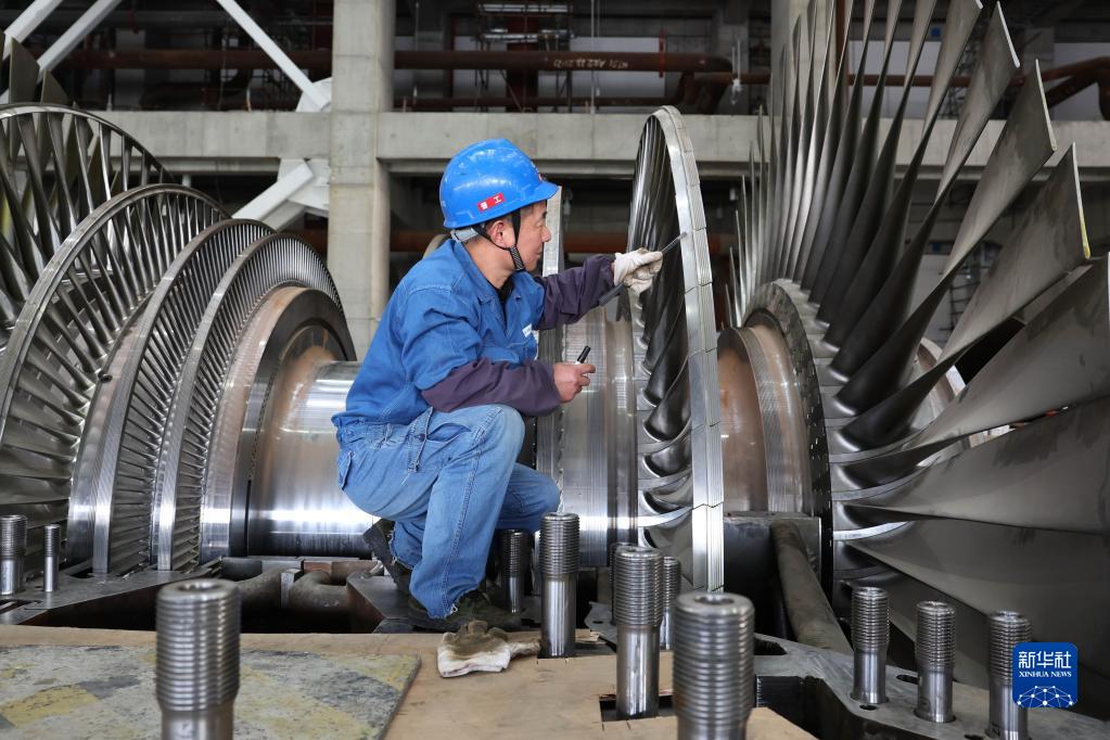 4月13日,一名工人在江蘇省射陽(yáng)縣射陽(yáng)港電廠(chǎng)四期百萬(wàn)千瓦燃煤發(fā)電機組1號汽輪機組設備安裝現場(chǎng)工作。