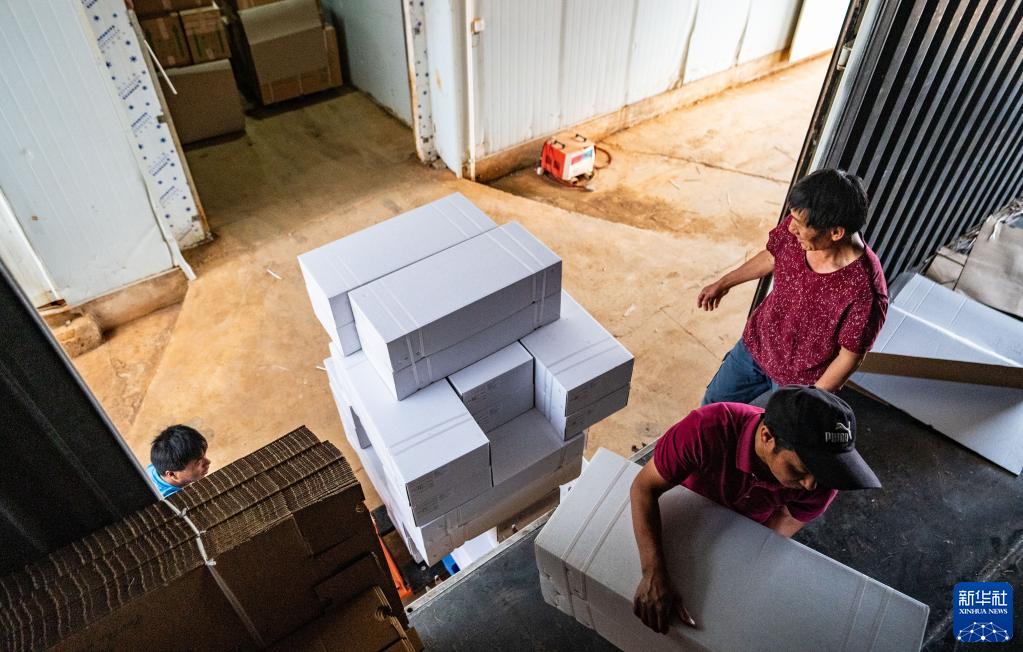 云南省開(kāi)遠市鮮花基地內的工作人員搬運已裝箱的鮮花(3月22日攝)。