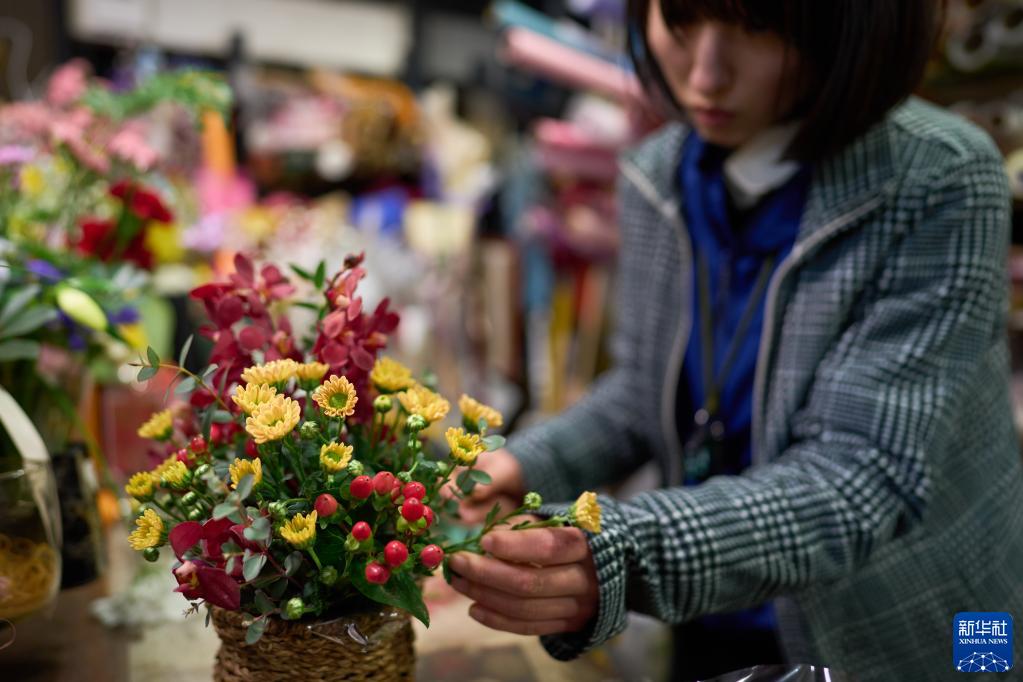 在日本千葉縣千葉市,花店店員產(chǎn)方美希將小西武送來(lái)的中國云南進(jìn)口鮮花與其他不同產(chǎn)地鮮花一起制成花藍(4月3日攝)。