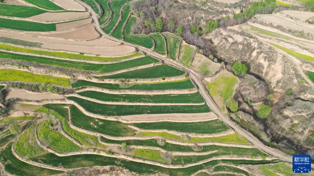 近日,甘肅省平?jīng)鍪谐缧趴h錦屏鎮縱橫交錯的梯田色彩斑斕,宛如春日大地“調色板”。