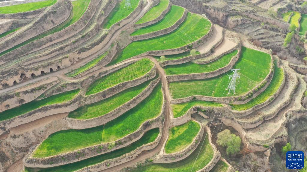 這是4月13日拍攝的甘肅省平?jīng)鍪谐缧趴h錦屏鎮境內的梯田(無(wú)人機照片)。
