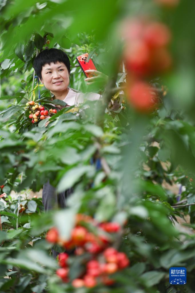 4月13日,游客在山東省臨沂市臨沭縣大興鎮一處櫻桃種植大棚內拍照。