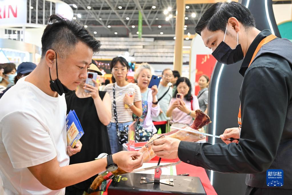 4月14日,觀(guān)眾在消博會(huì )現場(chǎng)品嘗西班牙火腿。