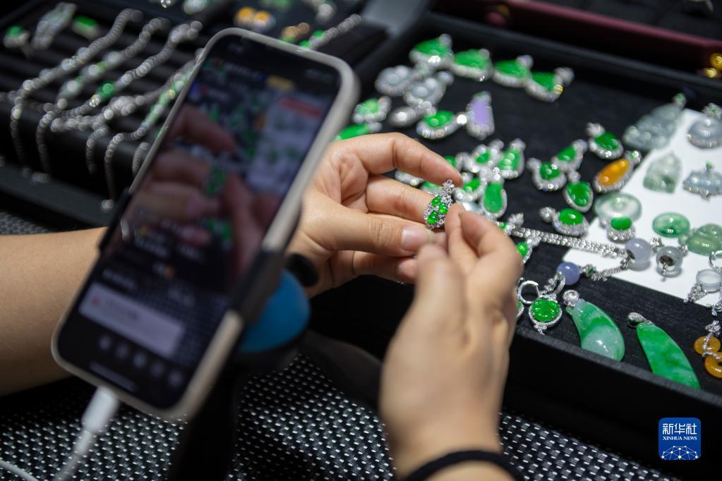 4月13日,在瑞麗多寶之城,一名珠寶商在直播賣(mài)貨。