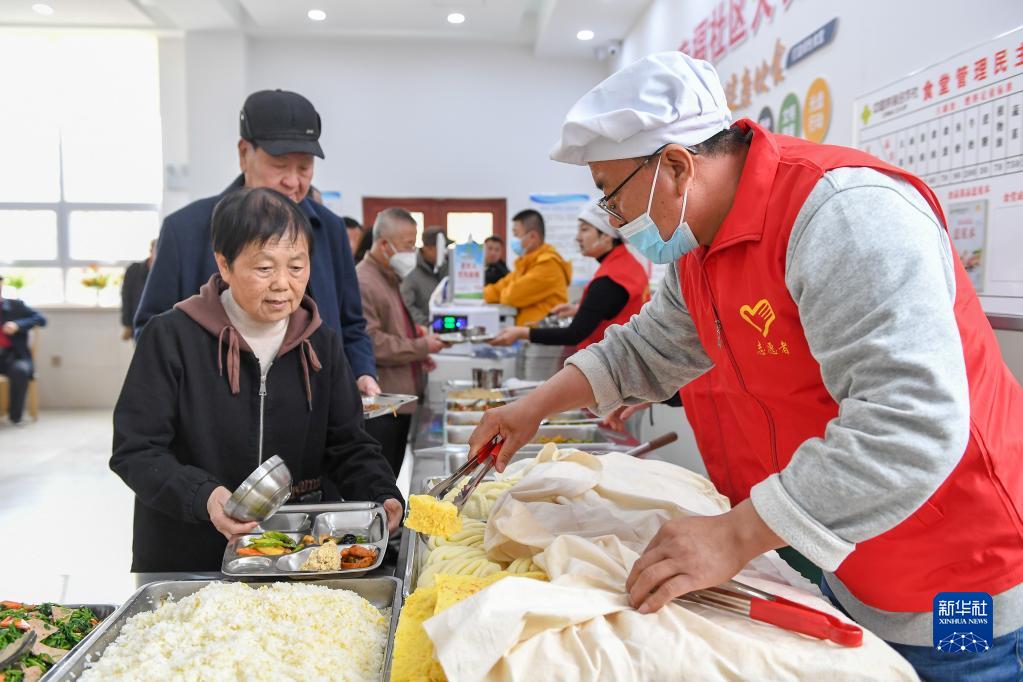 4月14日,在吉林省四平市梨樹(shù)縣幸福社區食堂,志愿者為老人盛菜。該食堂是吉林省民政廳重點(diǎn)支持的100個(gè)社區老年食堂之一。