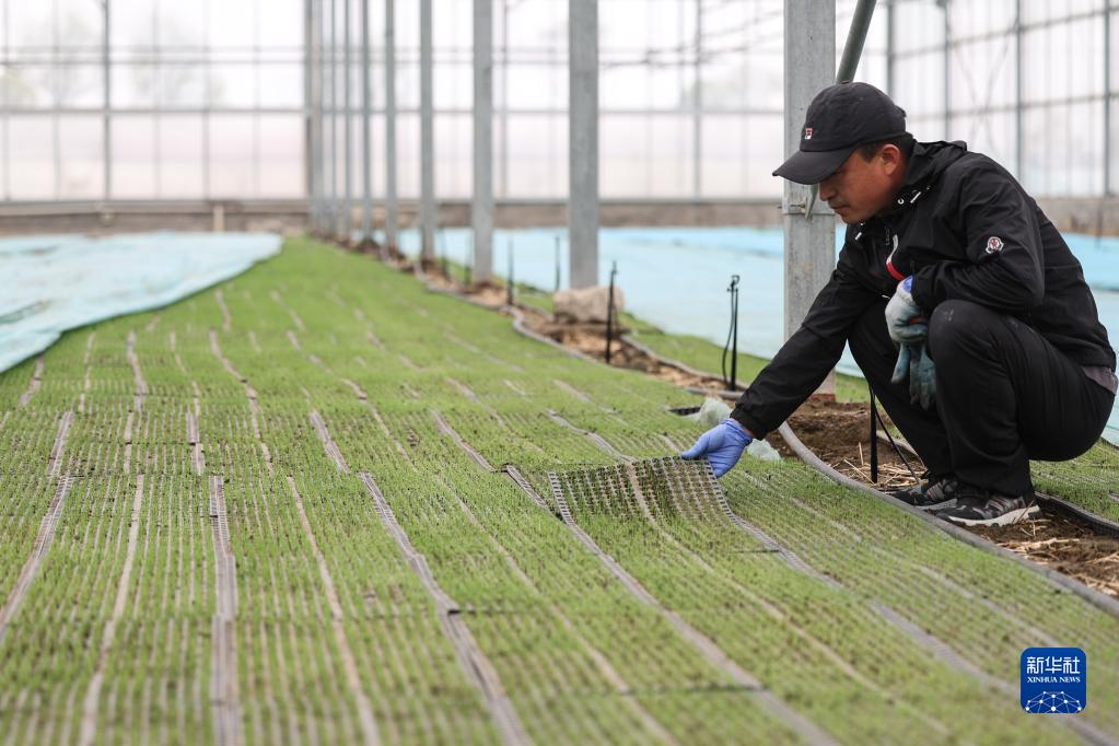 4月14日,盤(pán)錦市盤(pán)山縣的農戶(hù)在查看水稻秧苗的育苗情況。