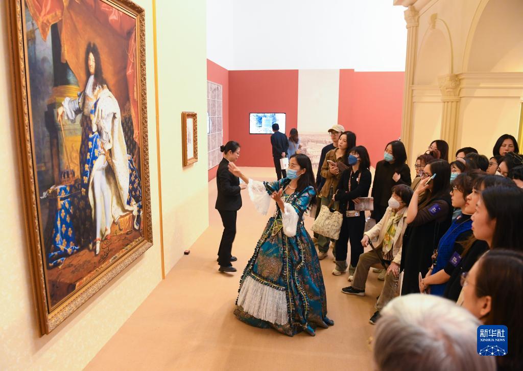 4月14日,工作人員向觀(guān)眾介紹路易十四肖像(左)和依據此畫(huà)創(chuàng )作的19世紀蝕刻版畫(huà)作品(右)。