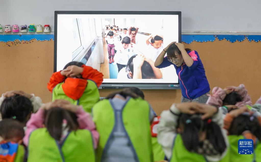 4月14日,在貴州省貴陽(yáng)市開(kāi)陽(yáng)縣第六幼兒園,老師給孩子們示范正確的地震逃生方式。