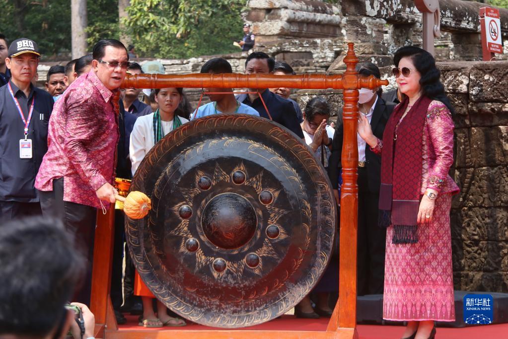 4月14日,在柬埔寨暹粒吳哥古跡內,柬埔寨首相洪森(左)在宋干節慶?;顒?dòng)開(kāi)幕式上敲鑼。