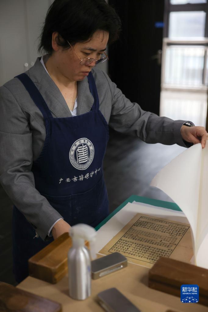 4月14日,在廣西壯族自治區圖書(shū)館古籍保護中心的工作室內,黃玉杏在整理修補好的古籍。