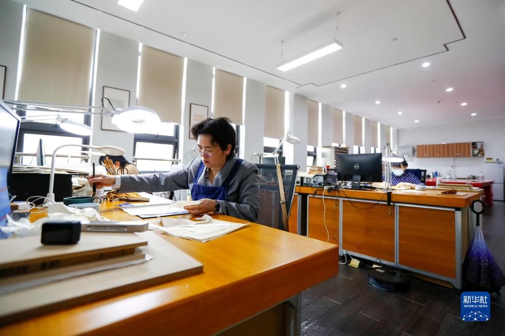 4月14日,在廣西壯族自治區圖書(shū)館古籍保護中心的工作室內,黃玉杏正在修復古籍。