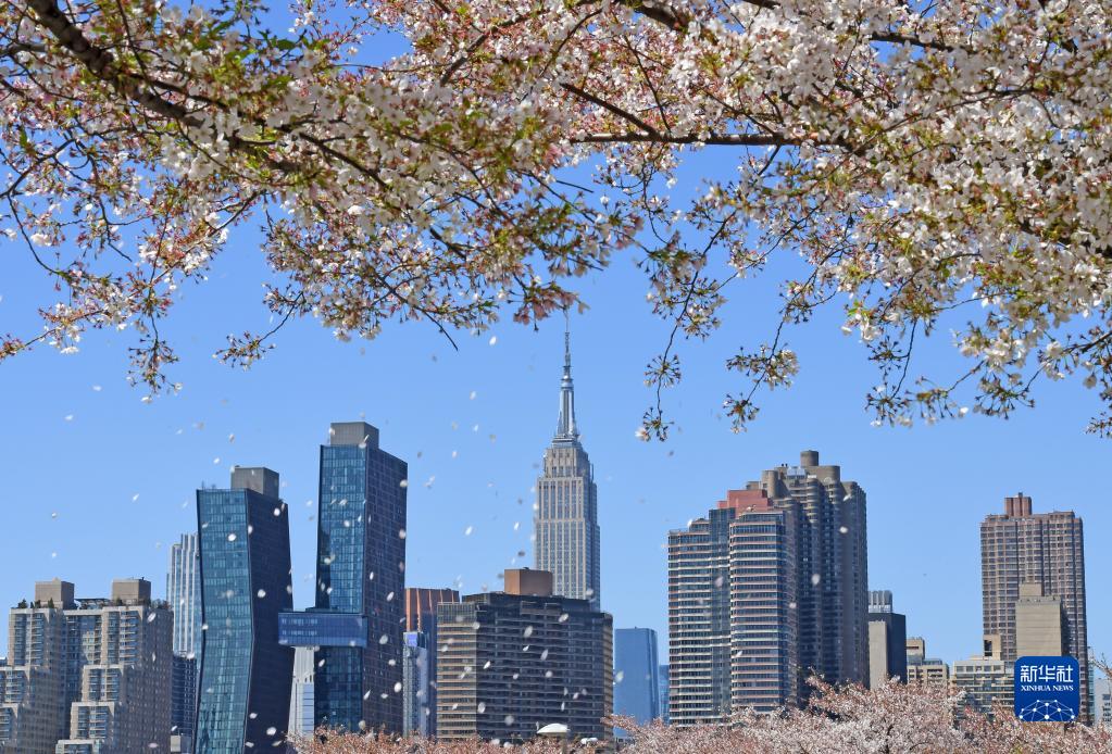 4月12日,在美國紐約,櫻花掩映遠處的帝國大廈(中)。
