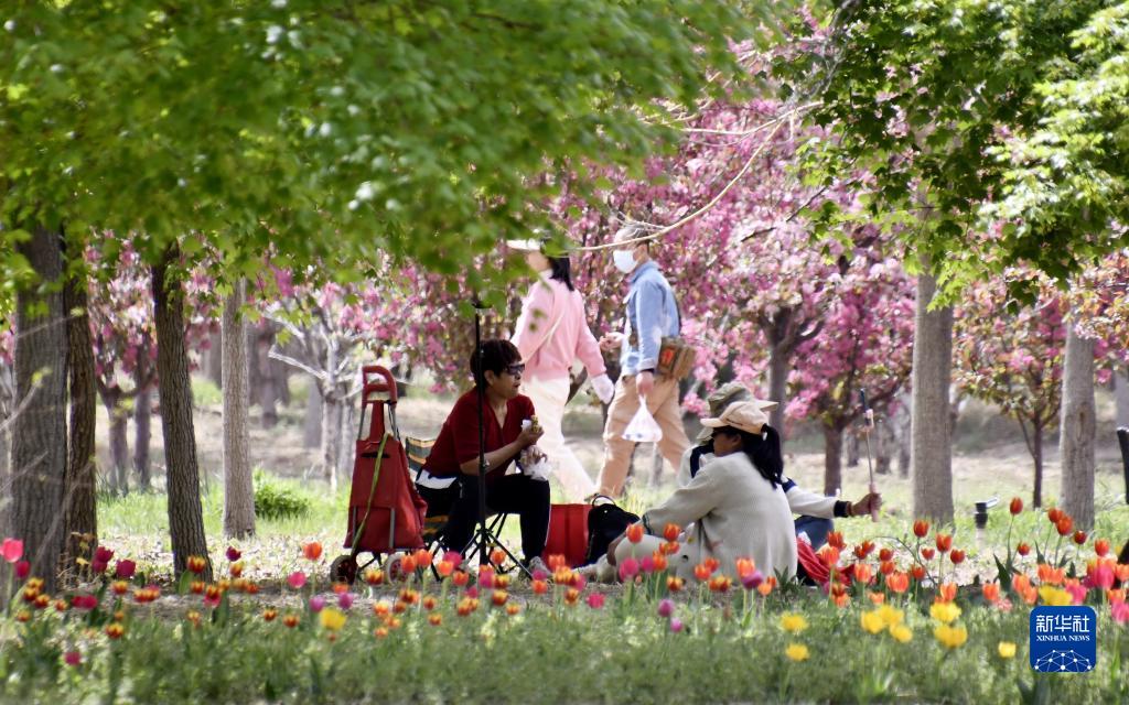 4月15日,游人在綠色港灣的林間花海中休閑。