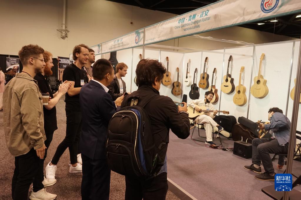 4月13日,在美國加利福尼亞州阿納海姆會(huì )展中心,參觀(guān)者在中國貴州正安吉他產(chǎn)業(yè)園一家公司展位觀(guān)看樂(lè )器表演。