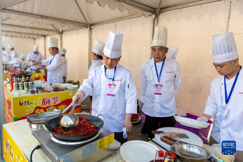 4月16日,在益陽(yáng)市南縣南洲廣場(chǎng),廚師們在進(jìn)行烹飪小龍蝦廚藝比拼。