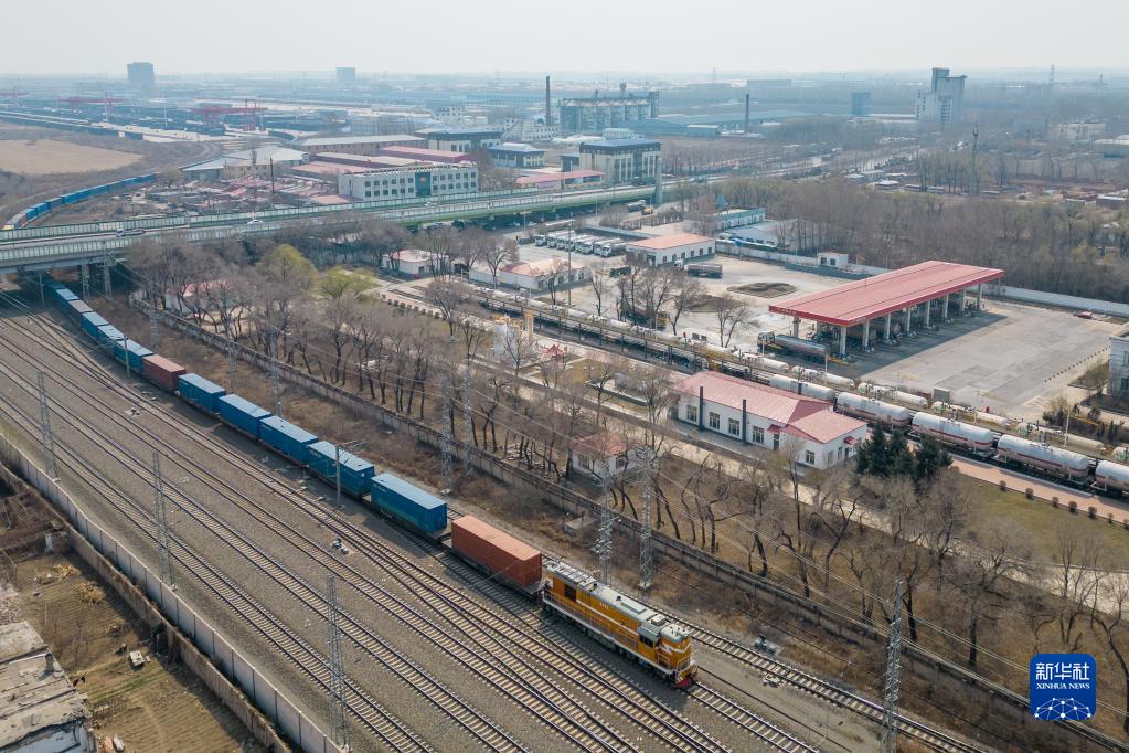 4月16日,國產(chǎn)品牌商品汽車(chē)中歐班列駛出哈爾濱國際集裝箱中心站(無(wú)人機照片)。