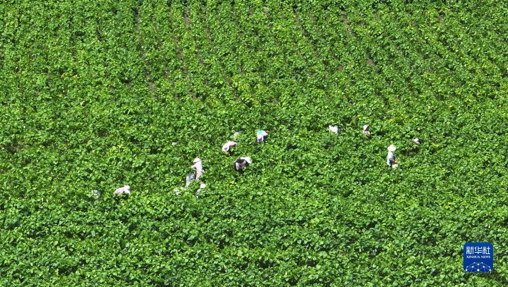 4月16日,在柳城縣沖脈鎮,農民在桑園里采摘桑葉(無(wú)人機照片)。