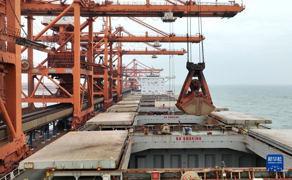 4月17日,一艘輪船靠泊在唐山港曹妃甸港區礦石碼頭(無(wú)人機照片)。