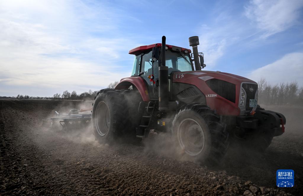 4月12日,在通遼市科爾沁左翼中旗腰林毛都鎮,農機在田間整地。