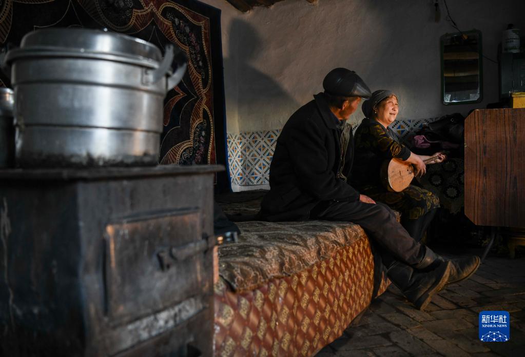 巴哈提和丈夫坐在家中休息,兩人聊起在外上學(xué)的小女兒,巴哈提拿起冬不拉彈唱一首歌曲表達思念(4月13日攝)。