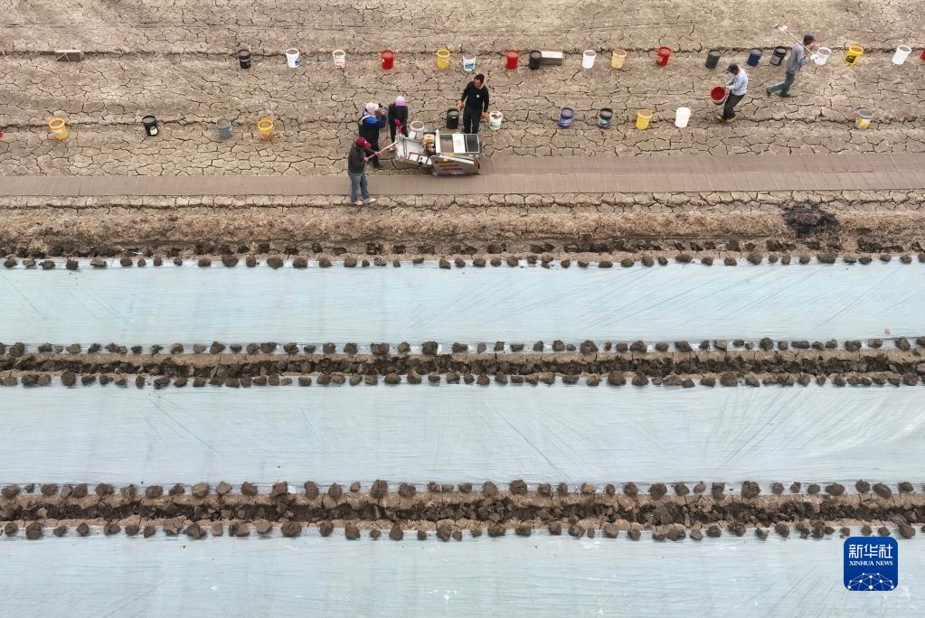 4月18日,唐山市豐南區西葛鎮的農民在田間使用機械設備育秧(無(wú)人機照片)。
