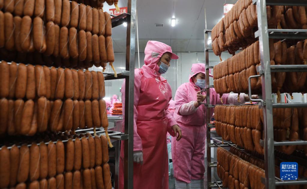 河南省武陟縣詹店鎮一家食品加工企業(yè)員工在車(chē)間加工香腸(3月29日攝)。