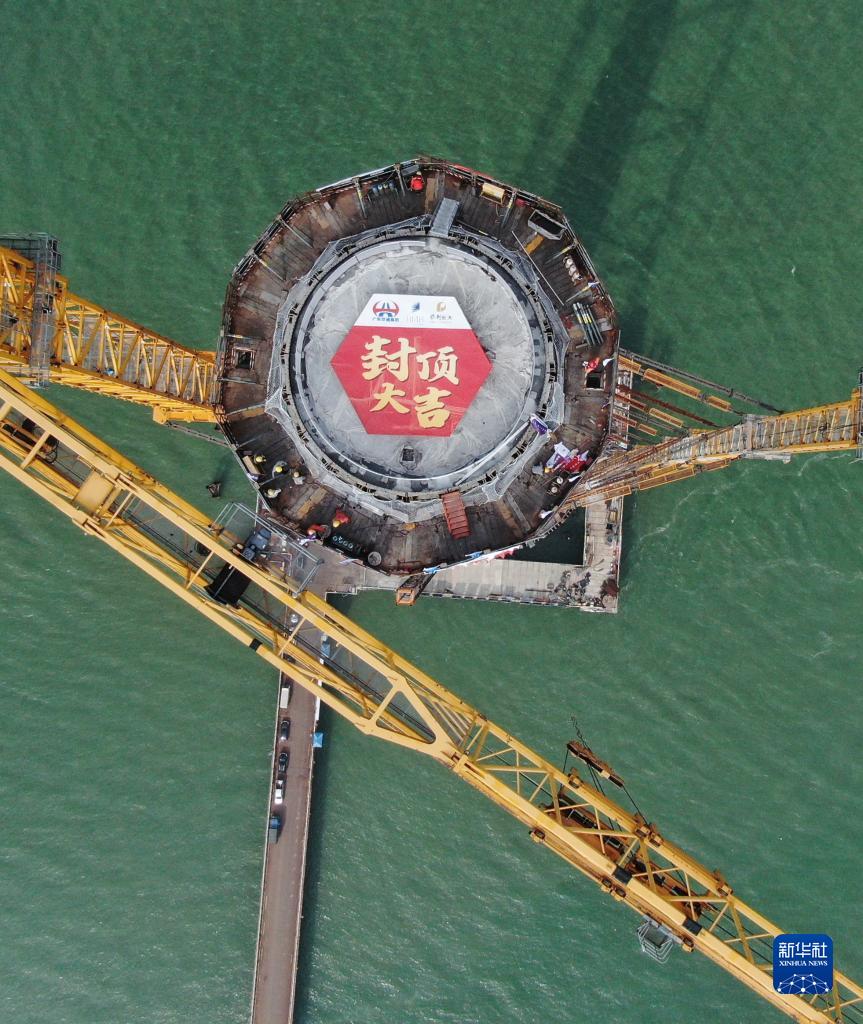 這是保利長(cháng)大承建的黃茅??绾Mǖ傈S茅海大橋中塔塔頂(4月17日攝,無(wú)人機照片)。