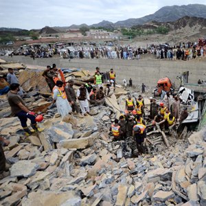 4月18日,在巴基斯坦開(kāi)伯爾-普什圖省多爾哈姆,人們聚集在山體滑坡現場(chǎng)。