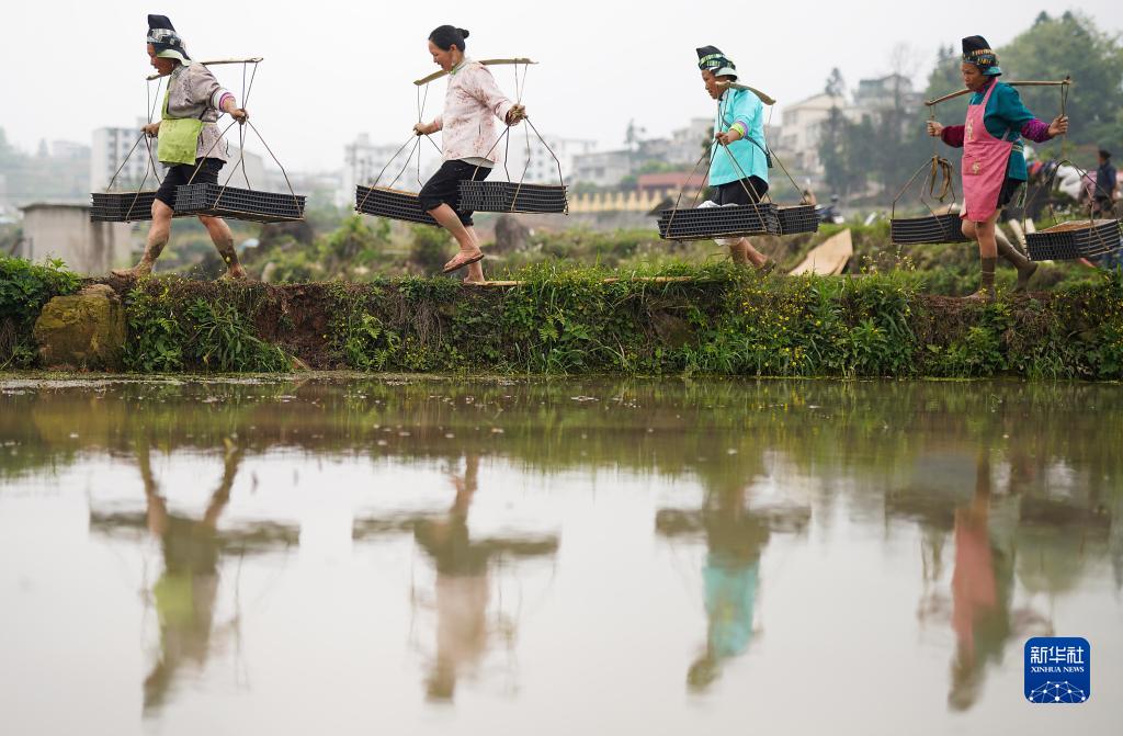 4月18日,貴州省黔東南苗族侗族自治州丹寨縣揚武鎮長(cháng)青社區村民在挑運水稻缽苗盤(pán)。
