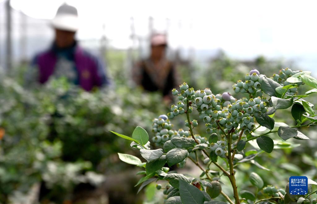 4月18日,在河北省邯鄲市峰峰礦區峰峰鎮一處藍莓種植大棚內,農民在采摘藍莓。