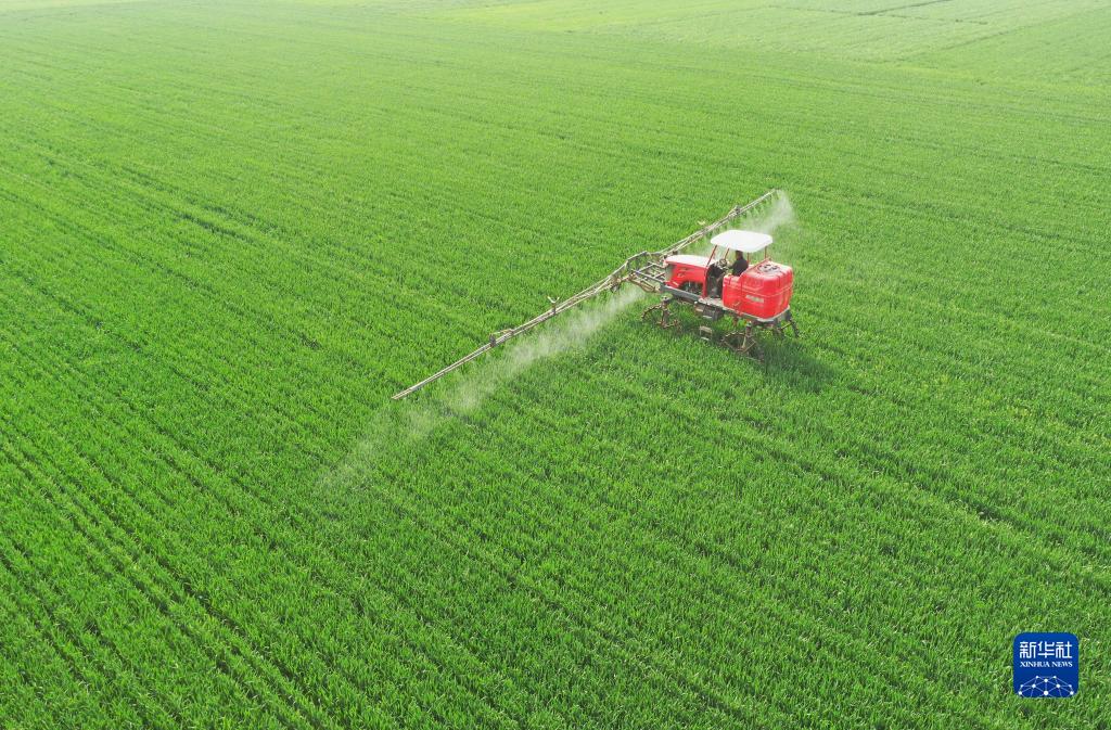4月19日,河北省邢臺市南和區河郭鎮張相村農民使用農業(yè)機械在麥田噴灑農藥(無(wú)人機照片)。