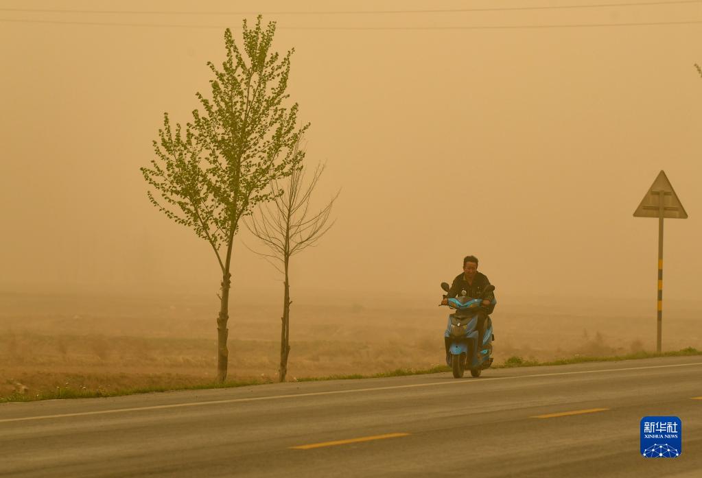4月19日,行人在寧夏吳忠市同心縣冒著(zhù)沙塵天氣出行。