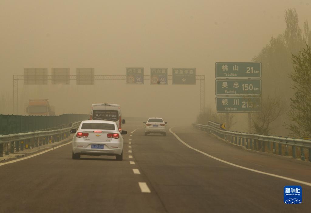 4月19日,車(chē)輛冒著(zhù)沙塵天氣在福銀高速同心段行駛。