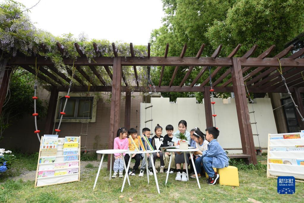 4月19日,吳興區八里店鎮中心幼兒園的老師帶著(zhù)孩子們在紫藤架下閱讀。