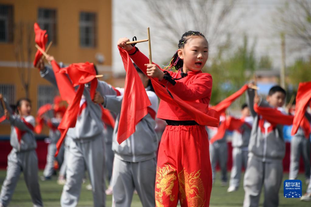 4月19日,門(mén)樓中心小學(xué)的學(xué)生在活動(dòng)中表演鼓韻操。