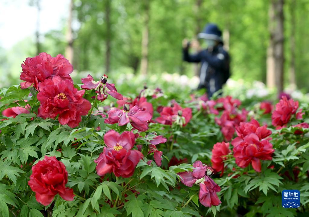 4月19日,游客在石家莊市植物園牡丹園內觀(guān)賞拍照。