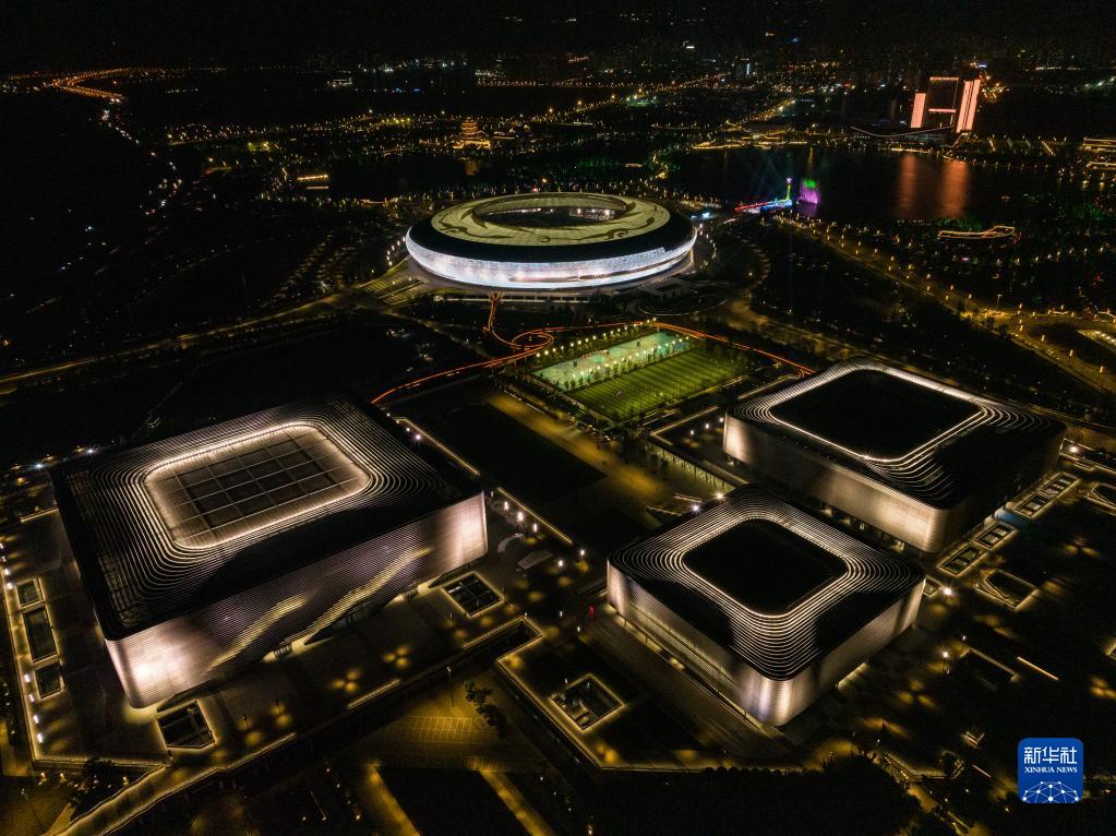 這是4月19日拍攝的東安湖體育公園內的第31屆世界大學(xué)生夏季運動(dòng)會(huì )開(kāi)幕式主體育場(chǎng)(后)以及三個(gè)運動(dòng)場(chǎng)館(前)(無(wú)人機照片)。
