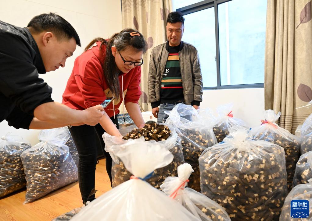 4月19日,屏南縣電商創(chuàng )業(yè)者楊晨芬(中)在嶺下鄉橫坑村羊肚菌菇種植戶(hù)魏供嶺(右一)家里收購。