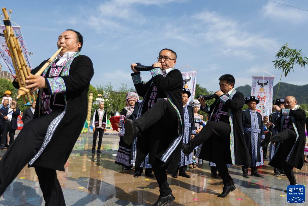 4月20日,苗族群眾吹著(zhù)蘆笙、牛角起舞。