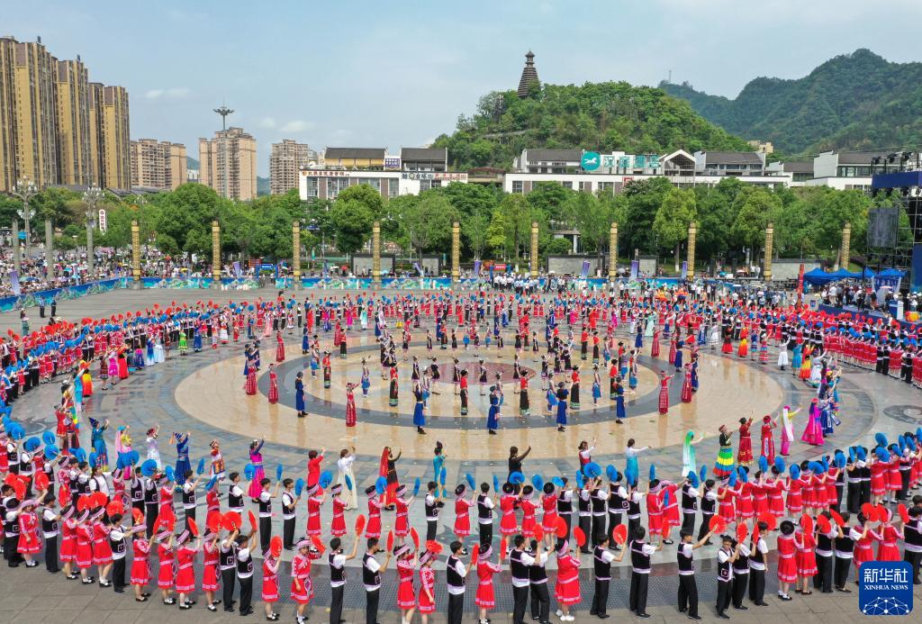 4月20日,當地群眾載歌載舞歡度苗族花山節(無(wú)人機照片)。