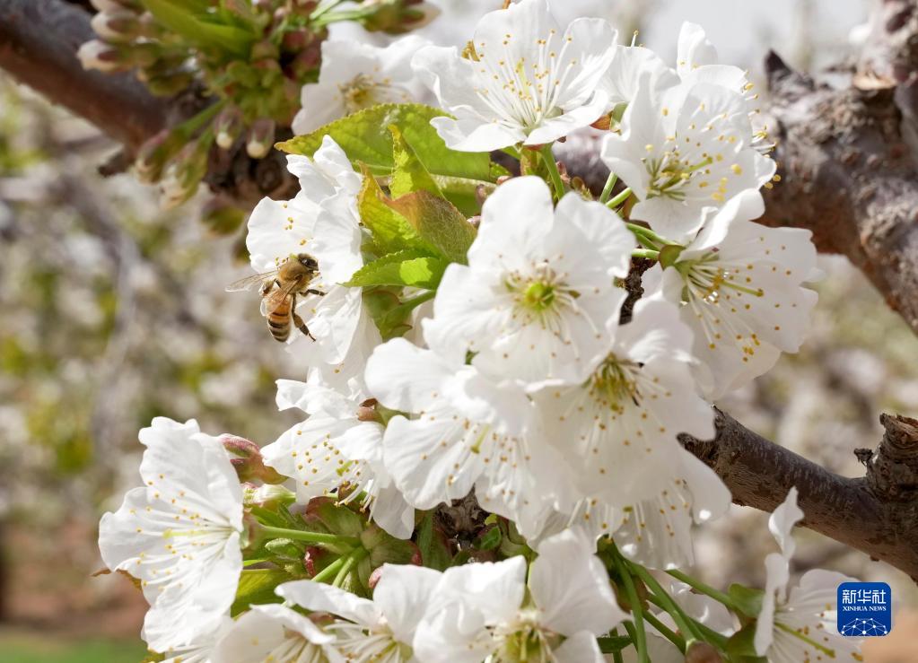 4月19日,在秦皇島市山海關(guān)區石河鎮一處櫻桃園,蜜蜂落在鮮花上采蜜。