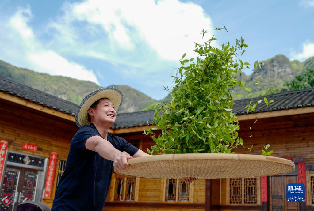 4月19日,重慶市南川區德隆鎮茶樹(shù)村一個(gè)居民點(diǎn),制茶工藝傳承人吳科在幫助村民翻曬新鮮茶葉。