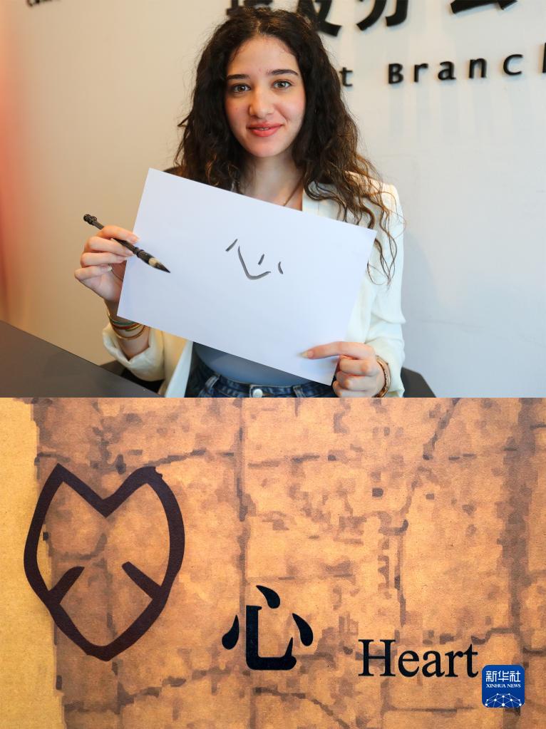 拼版照片:上圖為2023年4月13日,在埃及開(kāi)羅,阿斯瑪·穆斯塔法·易卜拉欣展示用毛筆書(shū)寫(xiě)的“心”字(新華社記者 隋先凱 攝);下圖為2023年4月19日在位于中國河南省安陽(yáng)市的中國文字博物館拍攝的“心”字甲骨文(左)(新華社記者 李安 攝)。