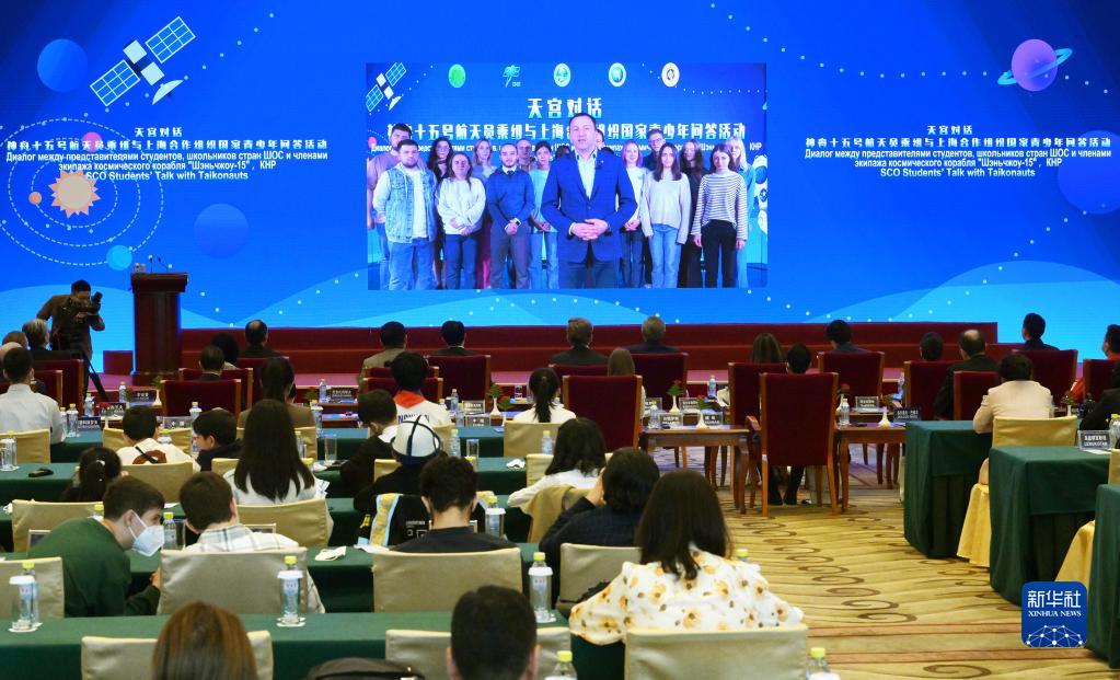 4月20日,俄羅斯青少年通過(guò)視頻屏幕向中國神舟十五號航天員提問(wèn)。新華社記者 李賀 攝