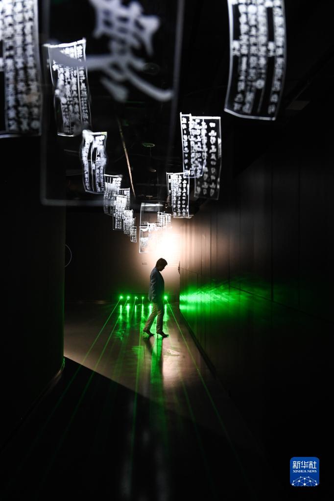 4月21日,一名讀者在嘉興市圖書(shū)館元宇宙閱讀體驗館內通過(guò)觸碰不同光線(xiàn)來(lái)感受音律的變化。