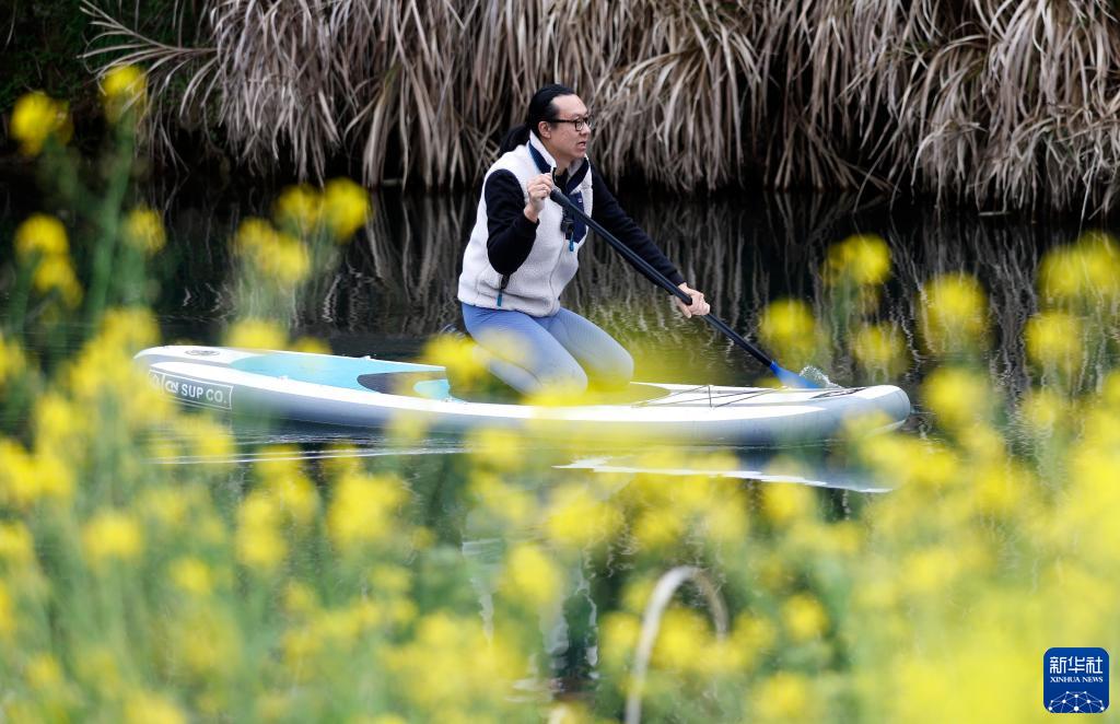 劉龍在民宿前的小河中劃槳板(3月29日攝)。