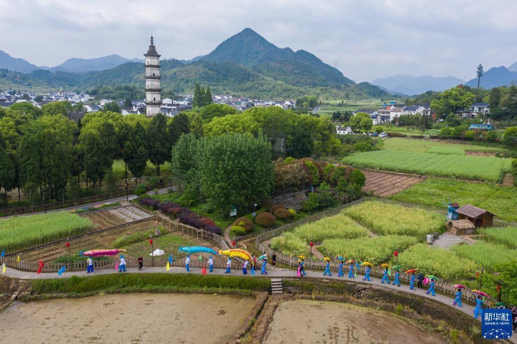 4月21日,“嚴州蝦燈”展演隊伍行走在建德市大慈巖鎮新葉古村的田野中(無(wú)人機照片)。