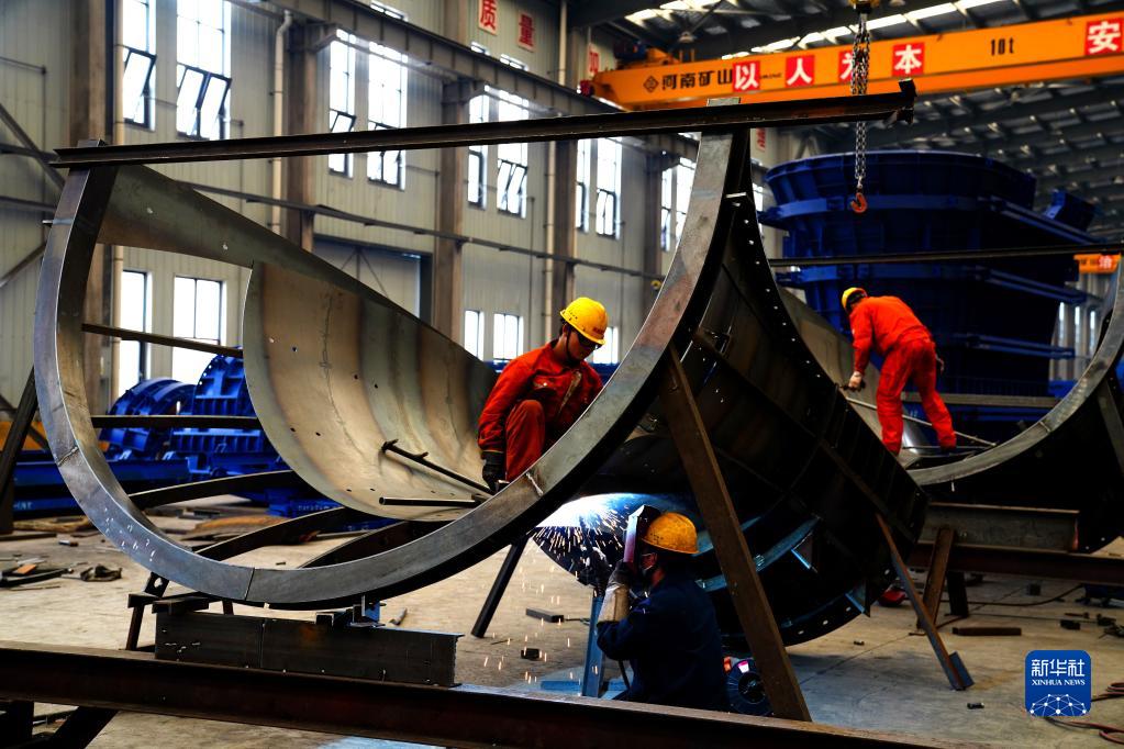 4月21日,在山東海德重工有限公司,工人在加工高鐵墩帽。