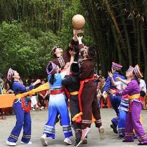 4月21日,在羅城縣米椎林景區,人們參加仫佬竹球比賽。