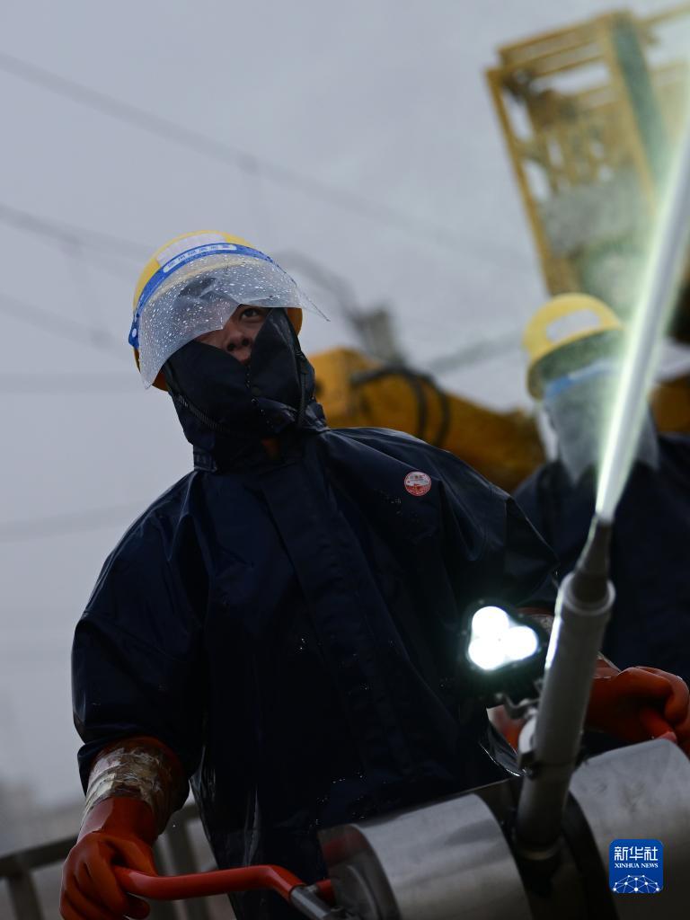 4月20日,中國鐵路青藏集團有限公司西寧供電段格爾木大修車(chē)間大修網(wǎng)工區檢修工王家彤使用高壓沖洗水槍對絕緣子設備進(jìn)行清洗。